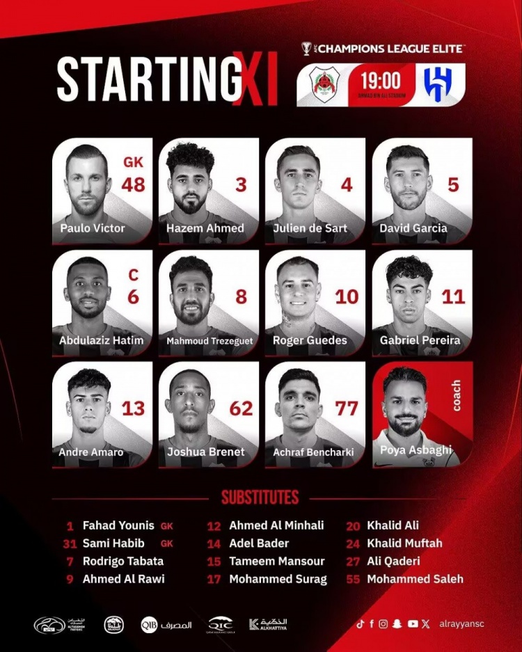 替补:21-奥瓦斯、17-阿里亚米、5-布莱希、88-哈马德、12-沙赫拉尼、4-哈利法、16-纳塞尔、15-卡塔尼、28-卡努、7-哈利德、99-哈姆丹