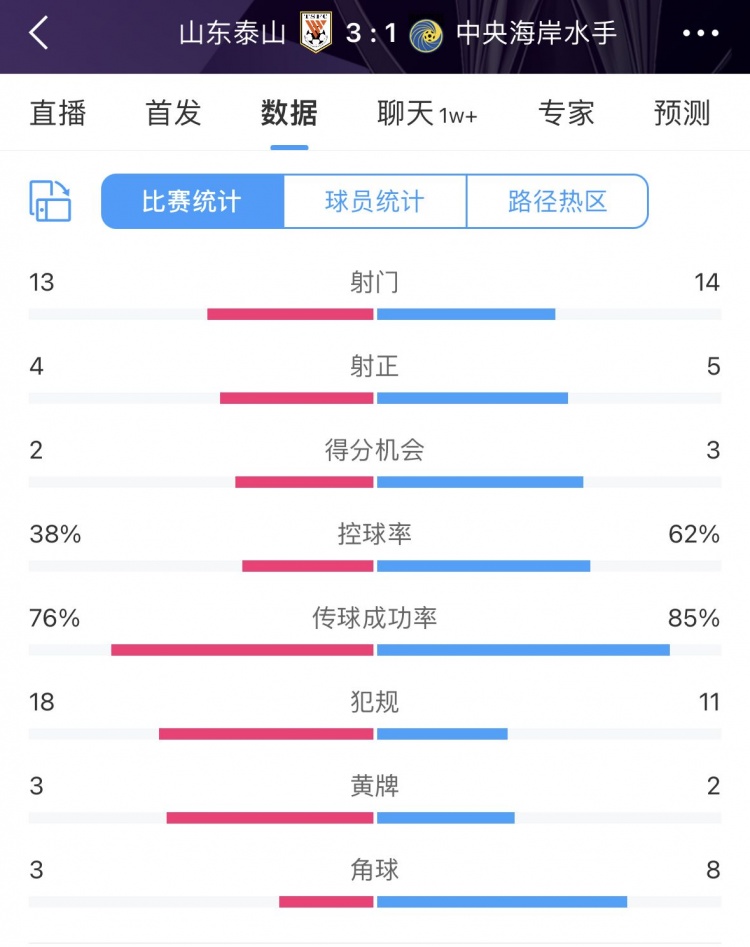 足坛汇9月17日讯 今晚进行的亚冠精英联赛首轮比赛,泰山主场3-1击败中央海岸水手取得了开门红。本场比赛在数据统计上,双方几乎势均力敌,但泰山队效率更胜一筹,4次射正取得3个进球。