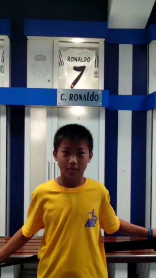 谢文能时隔10多年再次前往伯纳乌参观,晒出儿时与更衣室C罗球衣合影的照片。