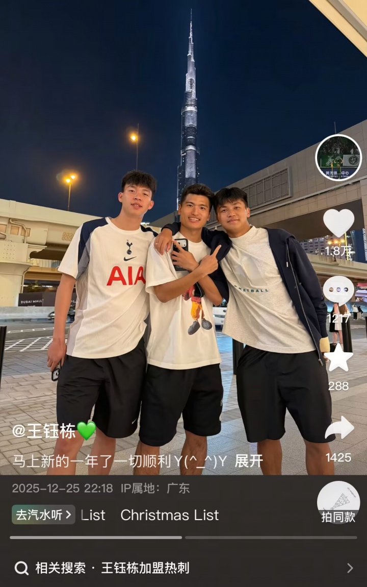 穿着热刺球衣!王钰栋与U22国足队友鲍盛鑫、蒯纪闻合影2025-12-26