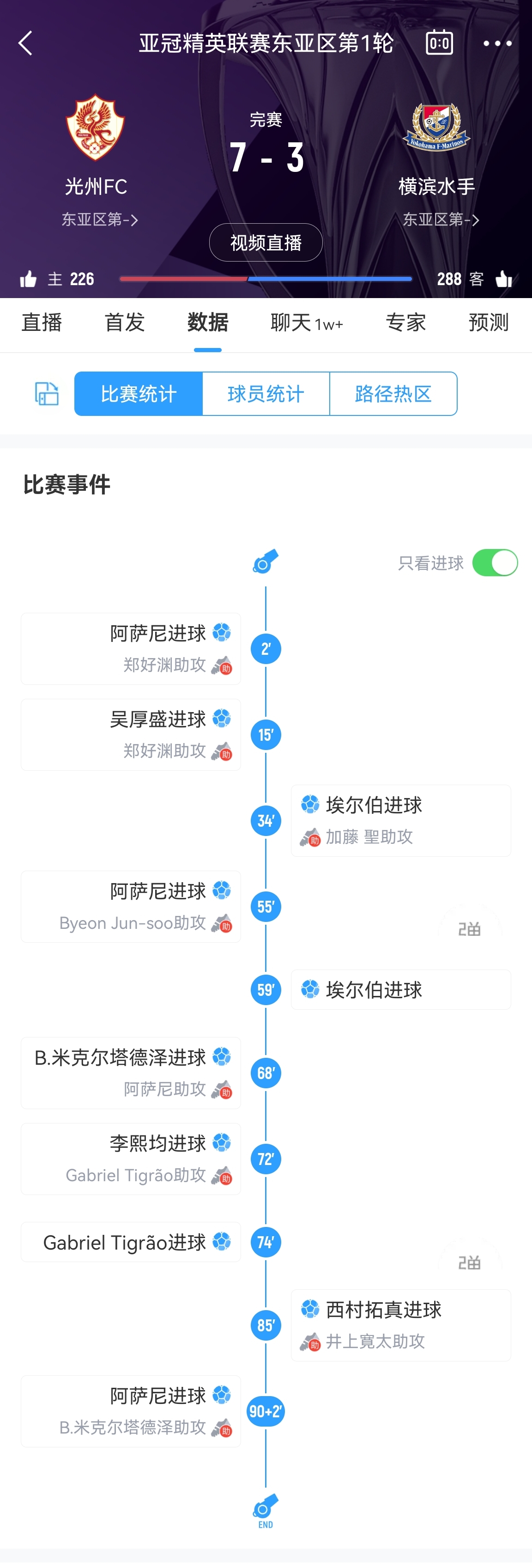 第78分钟,爱德华多染红下场,横滨水手少一人作战。第85分钟,西村拓真打入一球,横滨水手将比分追至3-6。补时阶段,阿萨尼再入一球完成帽子戏法,最终光州FC主场以7-3的比分大胜横滨水手,新赛季亚冠精英联赛迎来开门红。