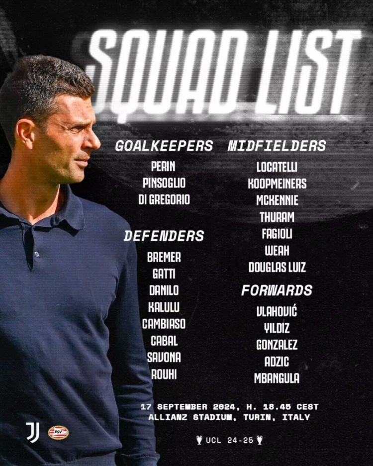 足坛汇9月17日讯 北京时间明天凌晨0:45,欧冠联赛阶段首轮尤文主场对阵埃因霍温,尤文公布了此役的球员名单,弗拉霍维奇、库普梅纳斯、道格拉斯-路易斯等球员在列,孔塞桑、米利克缺席。