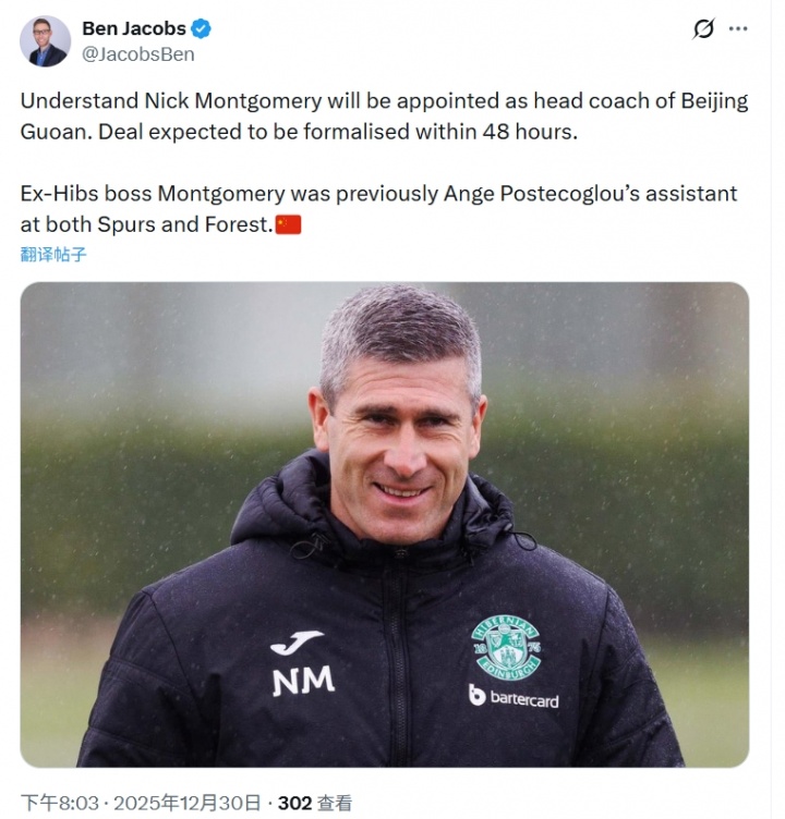 雅各布斯:前澳波助教蒙哥马利将出任国安主帅,48小时内签署协议2025-12-31
