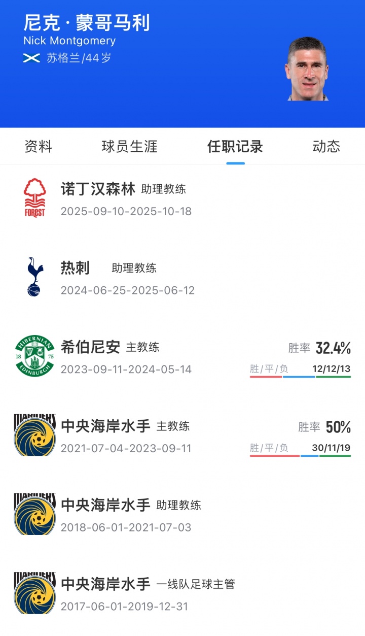 前希伯尼安主帅蒙哥马利现年44岁,苏格兰人,他此前曾担任澳波在热刺和诺丁汉森林的助理教练。