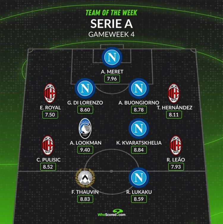 足坛汇9月17日讯 WhoScored根据球员评分列出了意甲第4轮最佳阵容,莱奥、卢卡库在列,那不勒斯占5席,米兰占4席。
