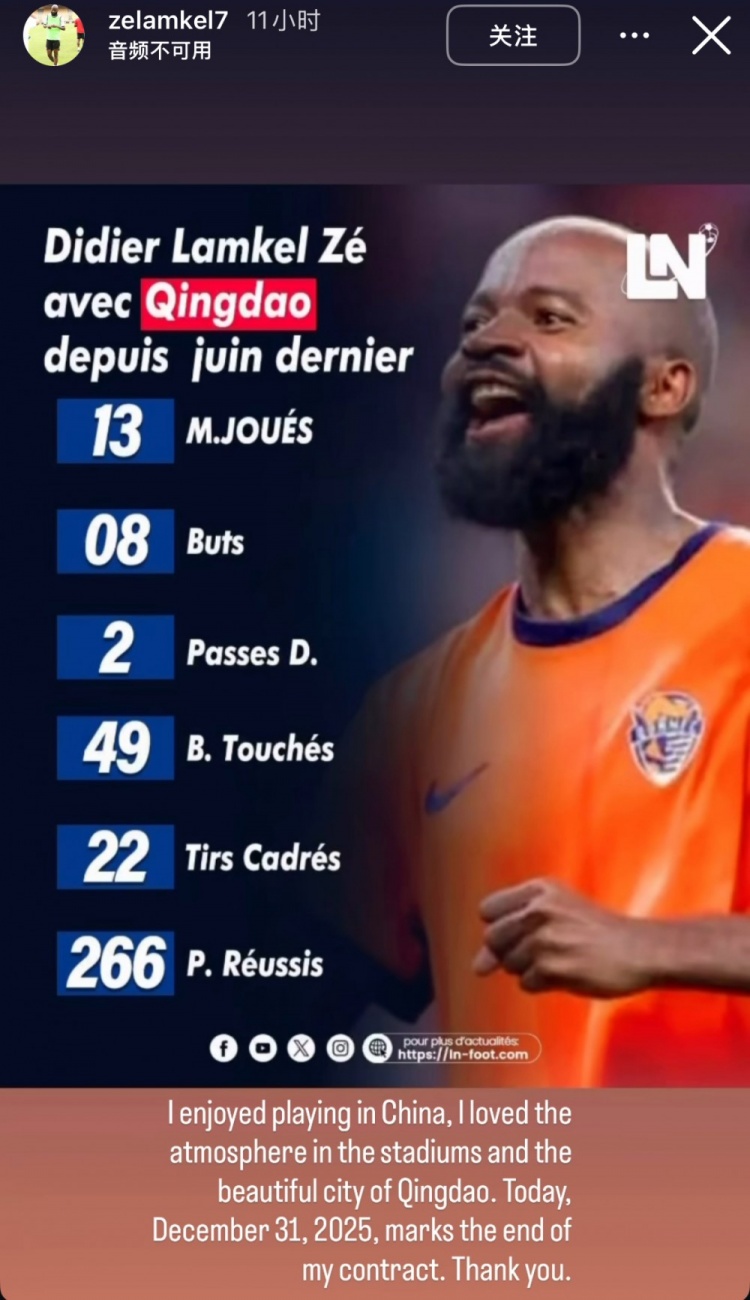 兰克尔·泽写道:“我非常享受在中国效力的时光,也非常喜爱青岛主场的热烈氛围,以及这座美丽城市。今天是2025年12月31日,这一天也意味着我与海牛的合约期限已到。谢谢你们。”