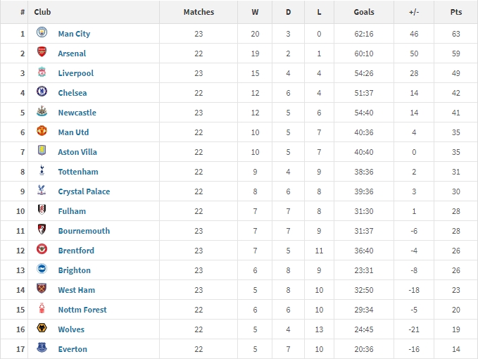若是计算2024年的年度积分榜,即上赛季下半段+本赛季4场,曼城和阿森纳将是断层前二的球队:曼城23场63分,阿森纳22场59分。利物浦和切尔西将在3/4名:利物浦23场49分,切尔西22场42分。