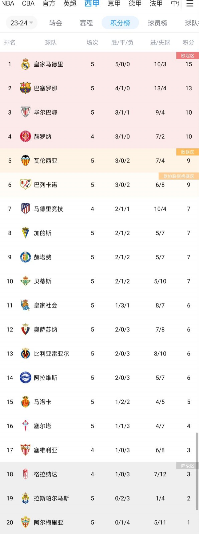 西甲本赛季比赛结束5轮对决,巴萨5连胜领跑西甲,皇马3胜2平排在第二。