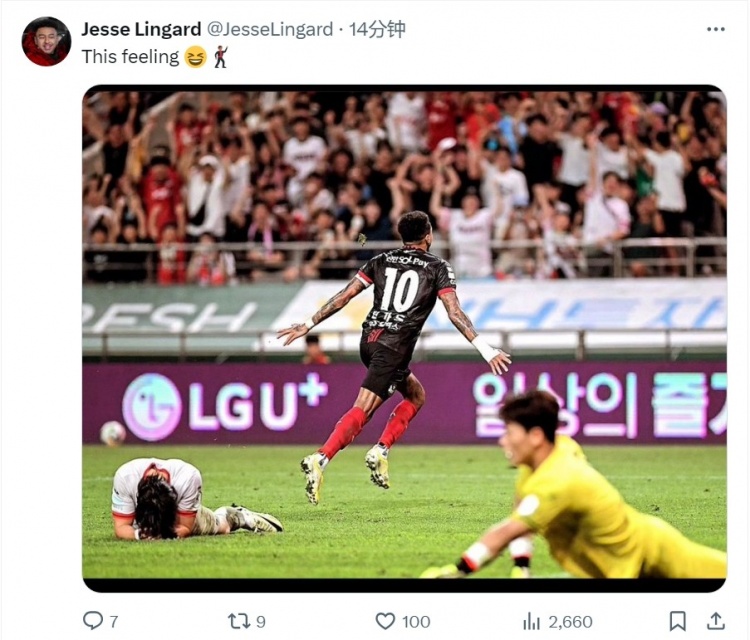 林加德在推特上晒出自己的比赛照片,并写道:“回归X(原推特),韩国很棒。享受我的足球,在一个快乐的地方。”