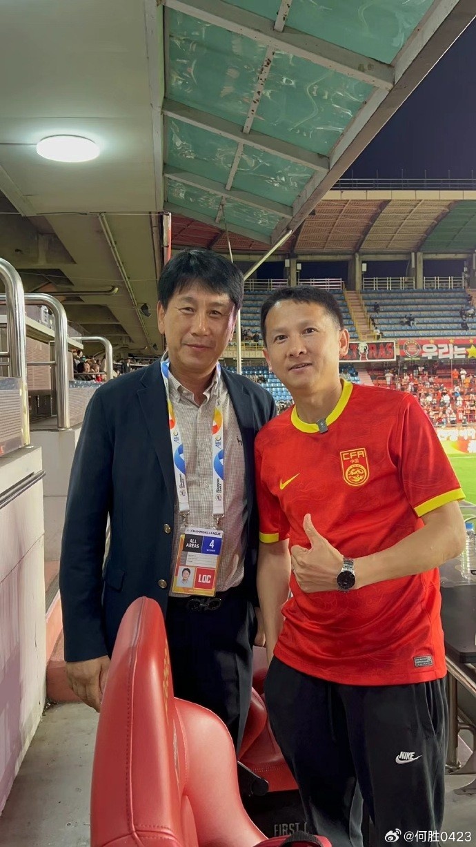何胜在社媒晒出了与浦项铁人主帅朴泰夏的合影并写道: