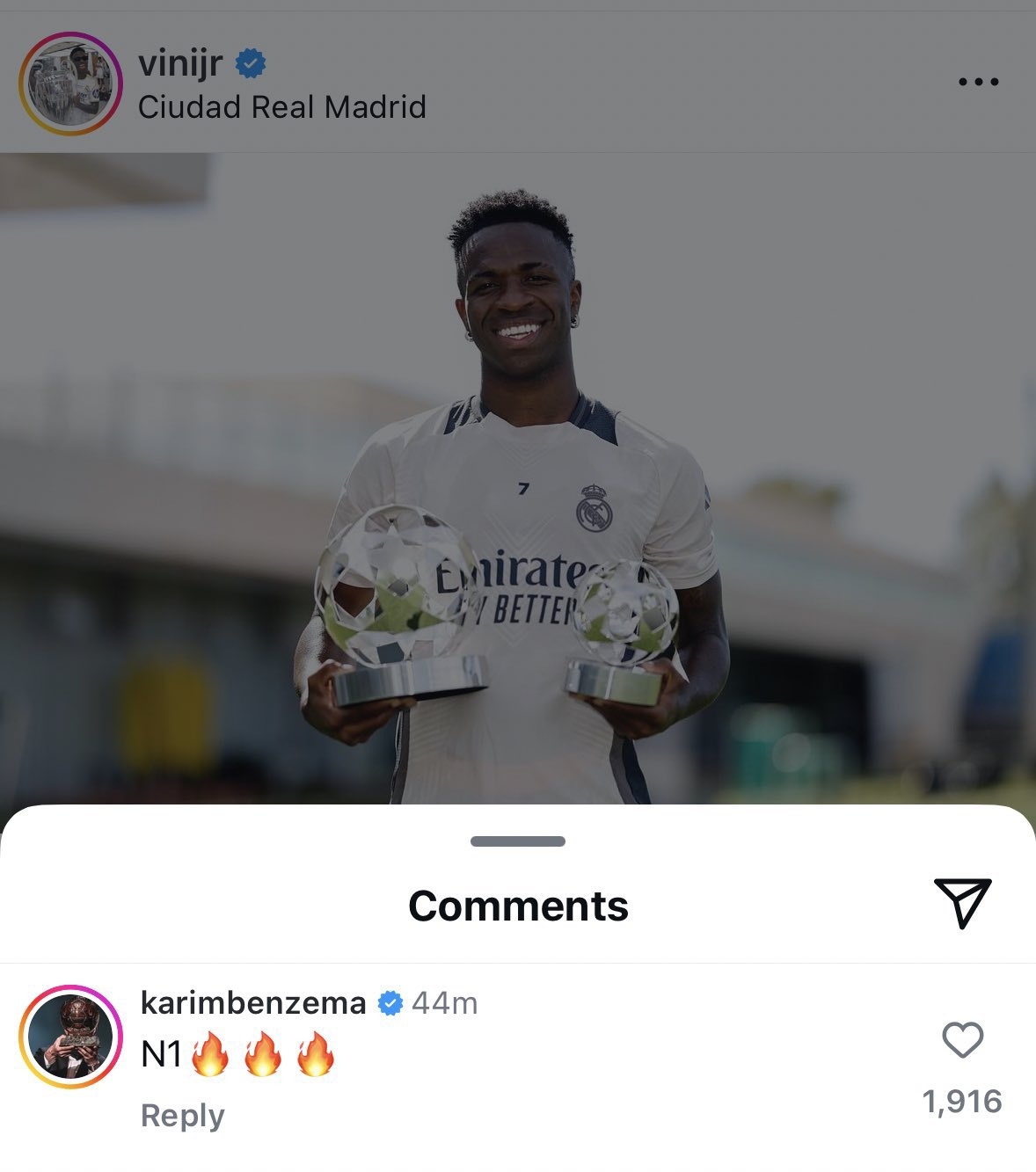 足坛汇9月17日讯 本泽马为维尼修斯的社媒动态留言,祝贺他当选上赛季欧冠最佳球员。