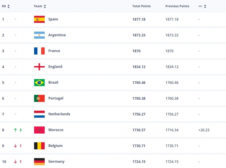 FIFA最新排名:西班牙阿根廷仍前二 摩洛哥升第8 塞内加尔升第12