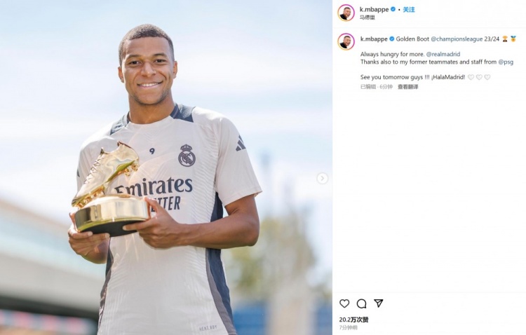 姆巴佩晒出自己手捧欧冠金靴的照片,并配文:“23-24赛季欧冠金靴。总是渴望随皇马赢得更多,也要感谢巴黎的前队友和工作人员。朋友们,明天见!马德里前进!”