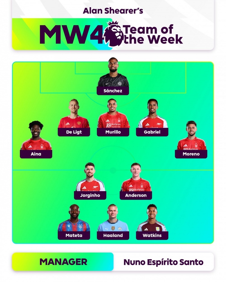足坛汇9月16日讯 英超名宿希勒评选了英超第4轮最佳阵容,德里赫特、哈兰德等人入选。