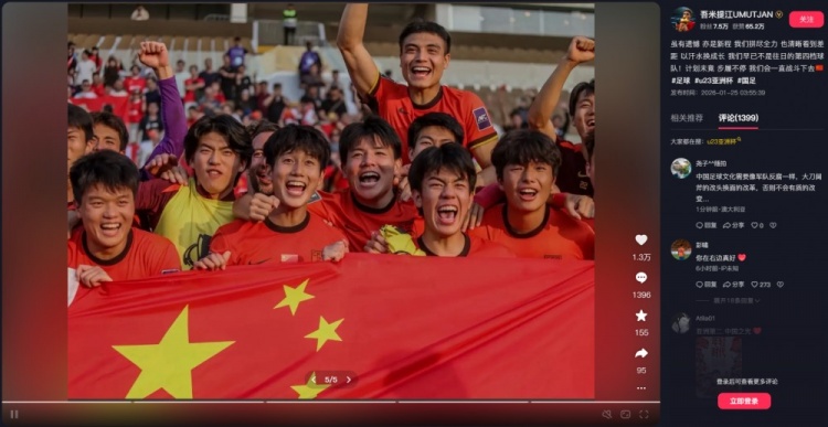 1月25日讯 在U23亚洲杯的比赛中,中国U23最终获得亚军的佳绩。比赛结束后,U23主力后卫吾米提江更新社媒,搭档彭啸也在评论区留言“你在右边真好”。