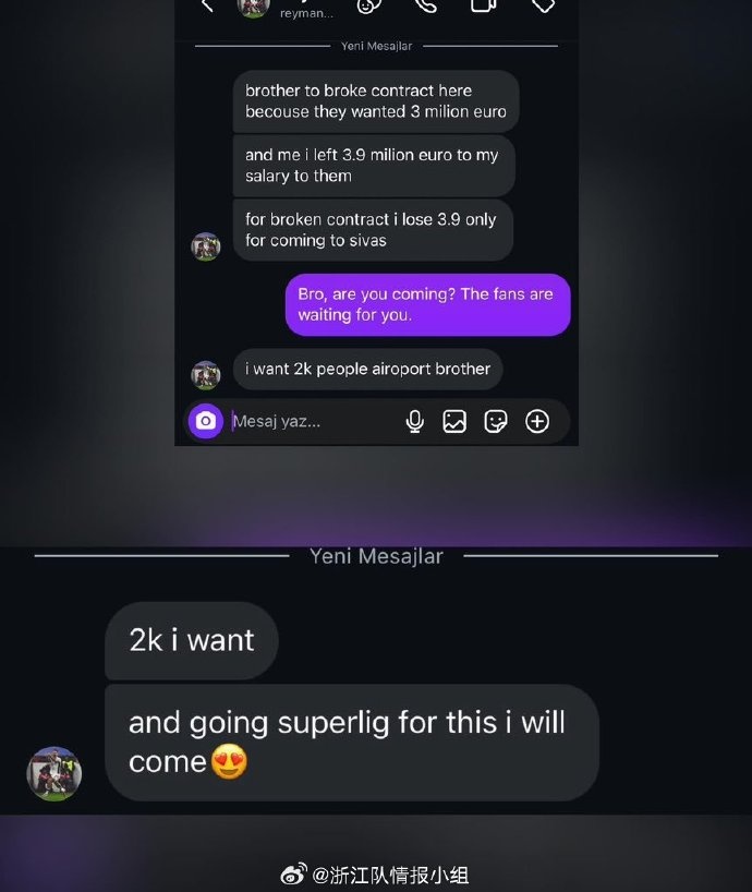 马纳伊在社媒私信中告知,他决定重新回归锡瓦斯体育,为此他放弃了390 万欧元的薪水以获取自由身,他的目标是帮助锡瓦斯体育重返土超。