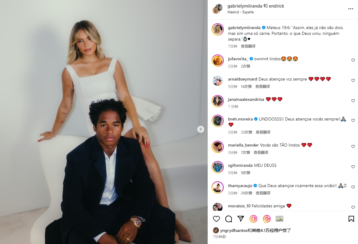 足坛汇09月16日讯 恩德里克和女友米兰达在社媒上发声,宣布双方将结为夫妻。