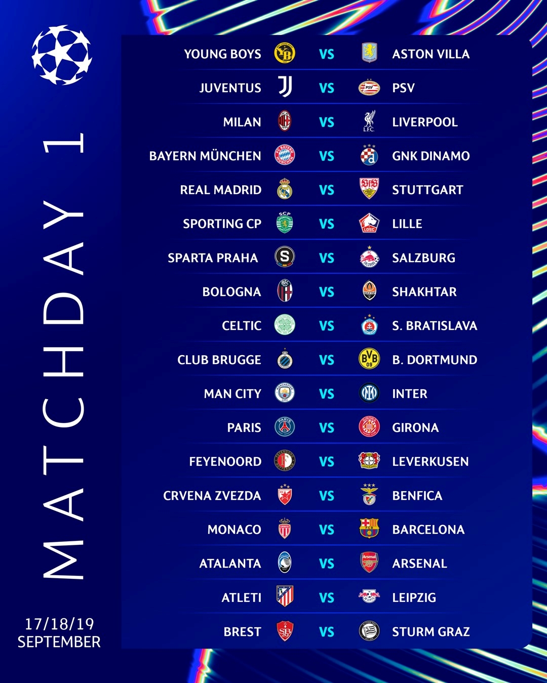 欧冠官推发布首轮赛事海报,18场比赛将分成周二、周三以及周四三个比赛日进行,首轮重头戏包括米兰vs利物浦、曼城vs国米等。