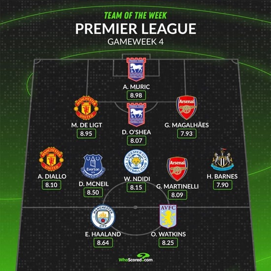 足坛汇9月16日讯 英超第4轮比赛战罢,WhoScored根据球员的评分列出本轮最佳阵容,哈兰德、马丁内利、德里赫特、阿玛德-达尼洛在列。