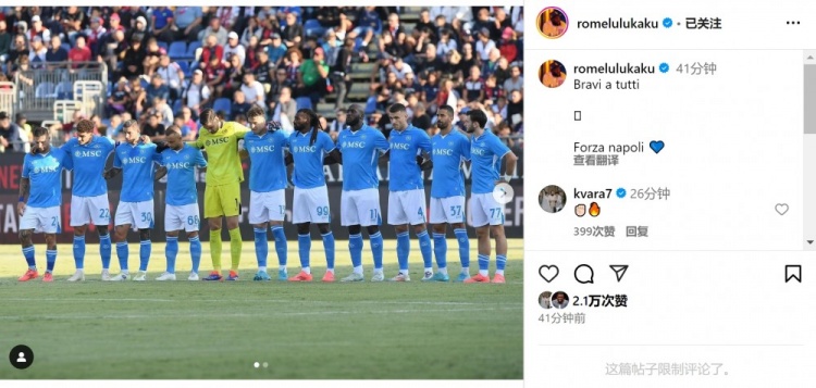 赛后卢卡库在社交媒体上晒出首发球员的合照,并写道:“大家干得好,加油那不勒斯。”