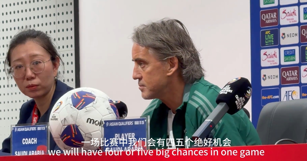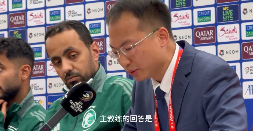 翻译:这位记者提的问题是,沙特队最近有没有强化相关的训练。主教练的回答是我们也有在强化相关的训练,因为我们知道在比赛中,如果在一场比赛中能扩大优势是非常重要的。比方说在一场比赛中能拿到5个甚至6个进球,这对我们是非常有利的。所以我们也有加强训练