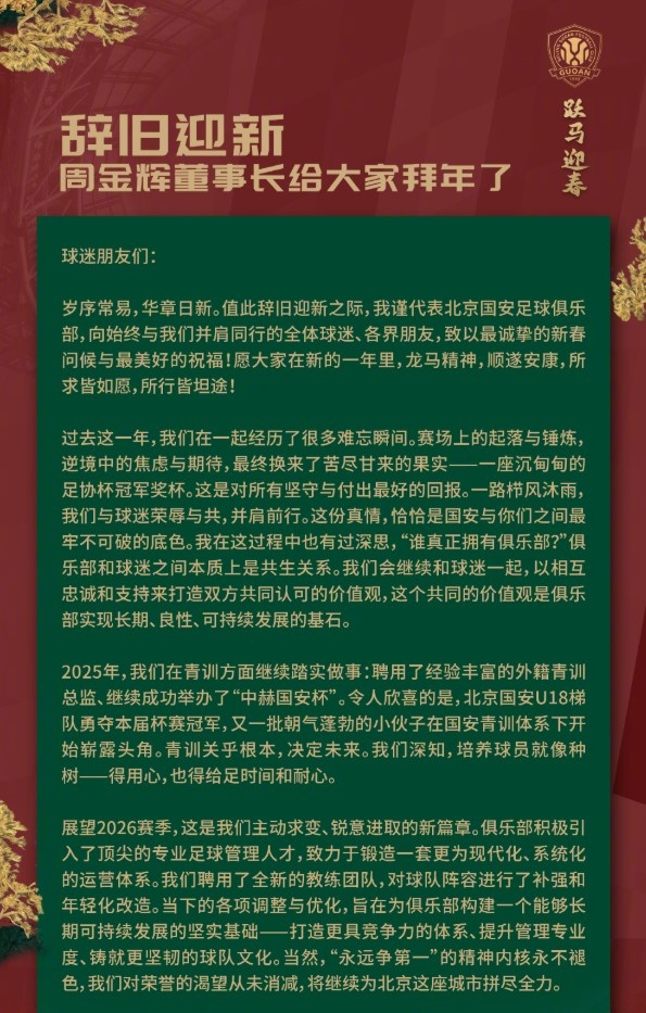 岁序常易,华章日新。值此辞旧迎新之际,我谨代表北京国安足球俱乐部,向始终与我们并肩同行的全体球迷、各界朋友,致以最诚挚的新春问候与最美好的祝福!愿大家在新的一年里,龙马精神,顺遂安康,所求皆如愿,所行皆坦途!