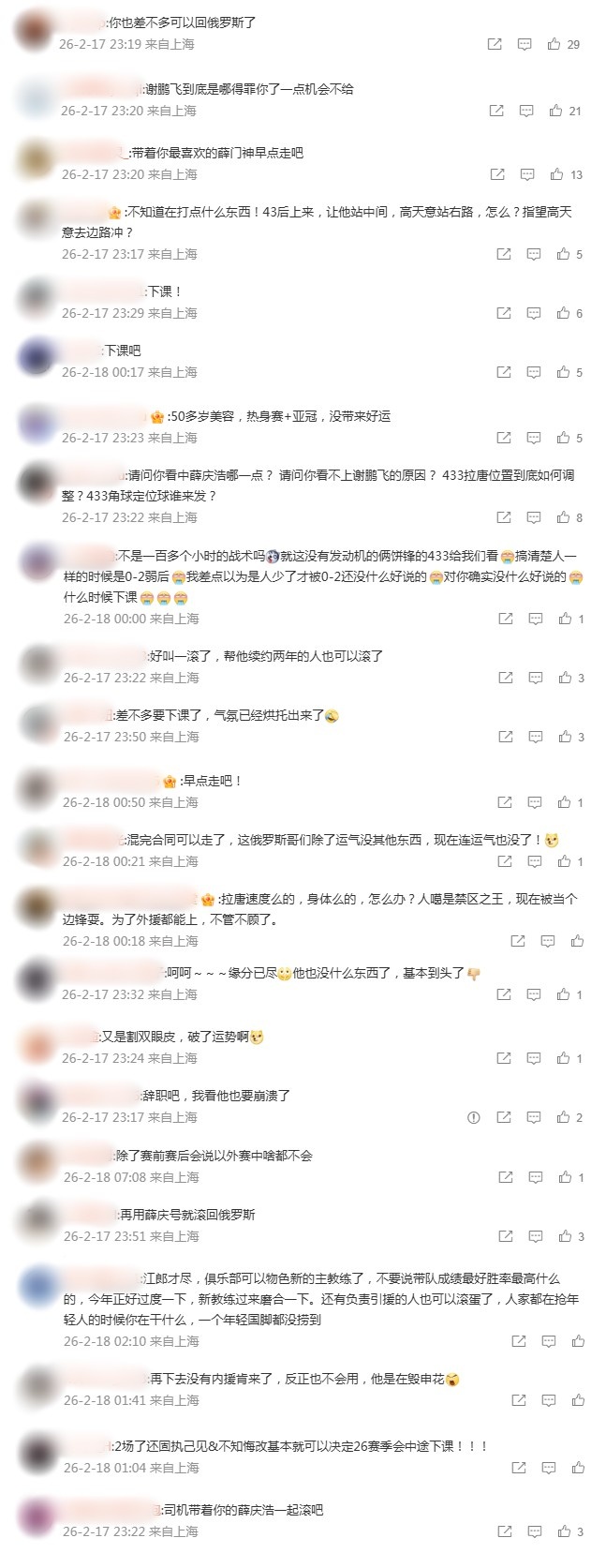 比赛结束后,申花球迷持续表达对斯卢茨基的不满。在申花官方微博的评论区,已经有很多球迷陆续喊出“下课”。