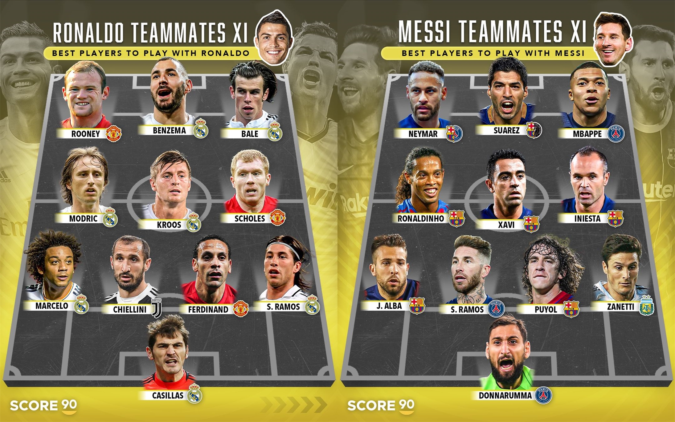 足坛汇09月16日讯 外媒盘点了C罗、梅西职业生涯,并从两人所有共事过的球员中各挑出了11人组成一队。