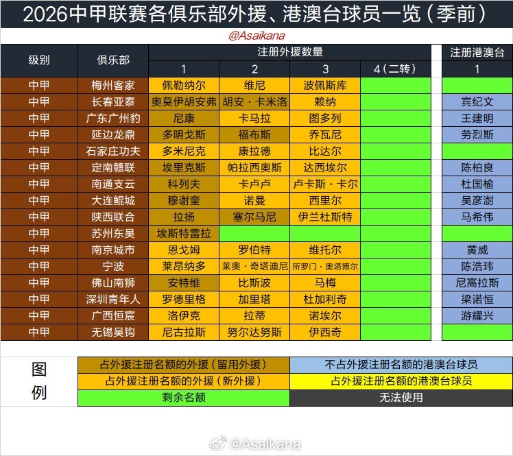 朱艺在个人微博中写道:2026中甲联赛冬窗正式关窗,中甲各队引援结束。以下为各俱乐部外援、港澳台球员一览。苏州东吴单外援,成为今年职业联赛唯一没有用满外援名额的球队。