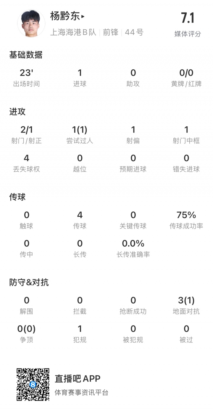 杨黔东出自恒大足校,今年2月自由身加盟上海海港。