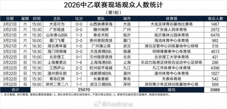 2026中乙联赛现场观众人数统计(第1轮) 2026-03-23