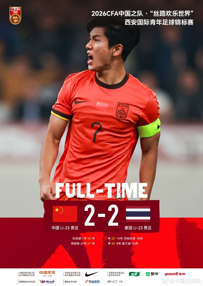 在刚刚结束的2026CFA中国之队·“丝路欢乐世界”西安国际青年足球锦标赛中,中国U-23男足上半场两球落后,下半场向余望、李新翔破门,最终,2比2战平泰国U-23男足。