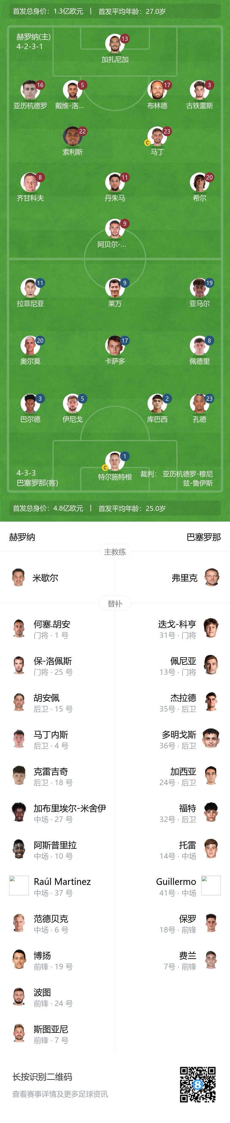 赫罗纳首发:13-加扎尼加、3-米格尔-古铁雷斯、5-大卫-洛佩斯、16-亚历杭德罗-弗朗西斯、17-布林德、22-索利斯、23-伊万-马丁、8-齐甘科夫、9-阿贝尔-鲁伊斯、20-布莱恩-希尔、11-丹朱马