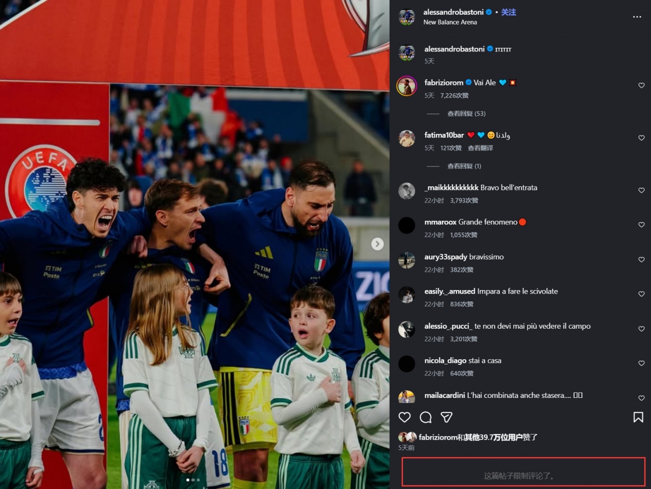 世欧预附加赛决赛,意大利不敌波黑,无缘晋级2026美加墨世界杯。巴斯托尼本场染红,赛后,他的社媒毫不令人意外地被冲了。
