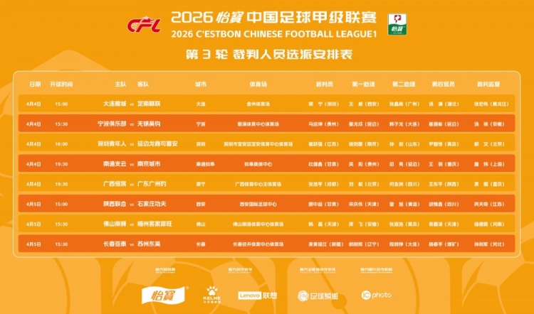 4月4日讯 中甲第3轮裁判公布,麦麦提江执法长春亚泰vs苏州东吴的比赛。在中超第2轮中,麦麦提江执法京鲁战漏判点球,他在中超第3轮和第4轮都无缘执法。