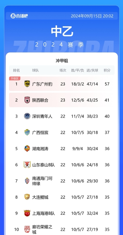 本场比赛结束之后,中乙比赛还剩5轮,广东广州豹积57分位列第一,陕西联合积41分位列第二。广东广州豹领先16分提前锁定一个中甲名额。