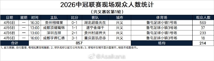 2026中冠联赛现场观众人数统计(兴义赛区第1轮),平均观众214人2026-04-07