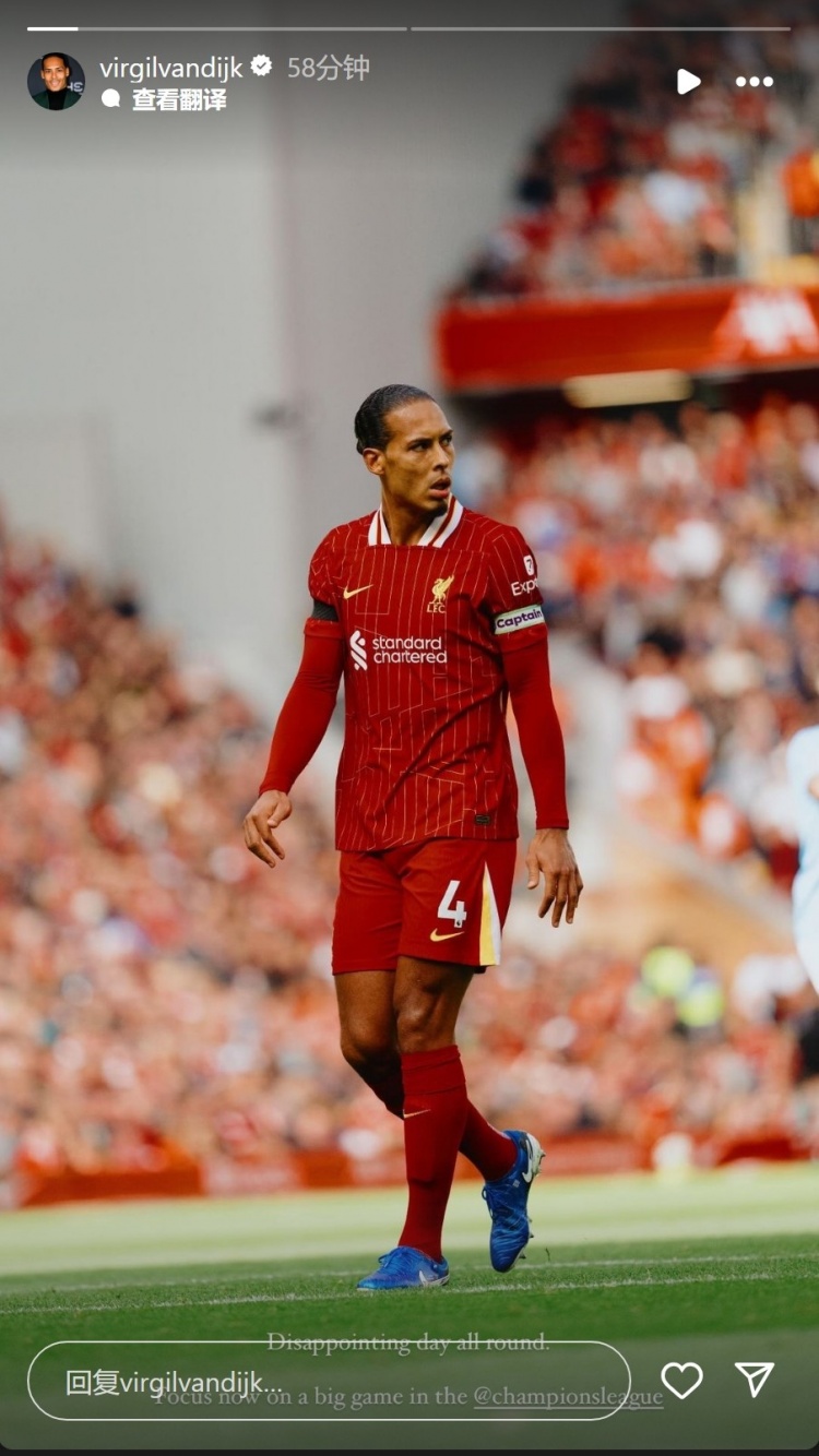 范迪克在社交媒体上晒出自己的赛场照片,并配文:“这是令人失望的一天。现在专注于一场重要的欧冠比赛。”
