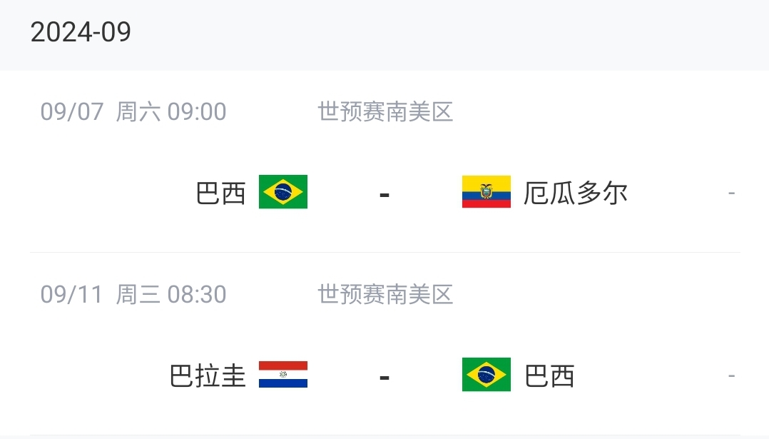 巴西将在9月世预赛对阵厄瓜多尔和巴拉圭,目前他们排在积分榜第6位。